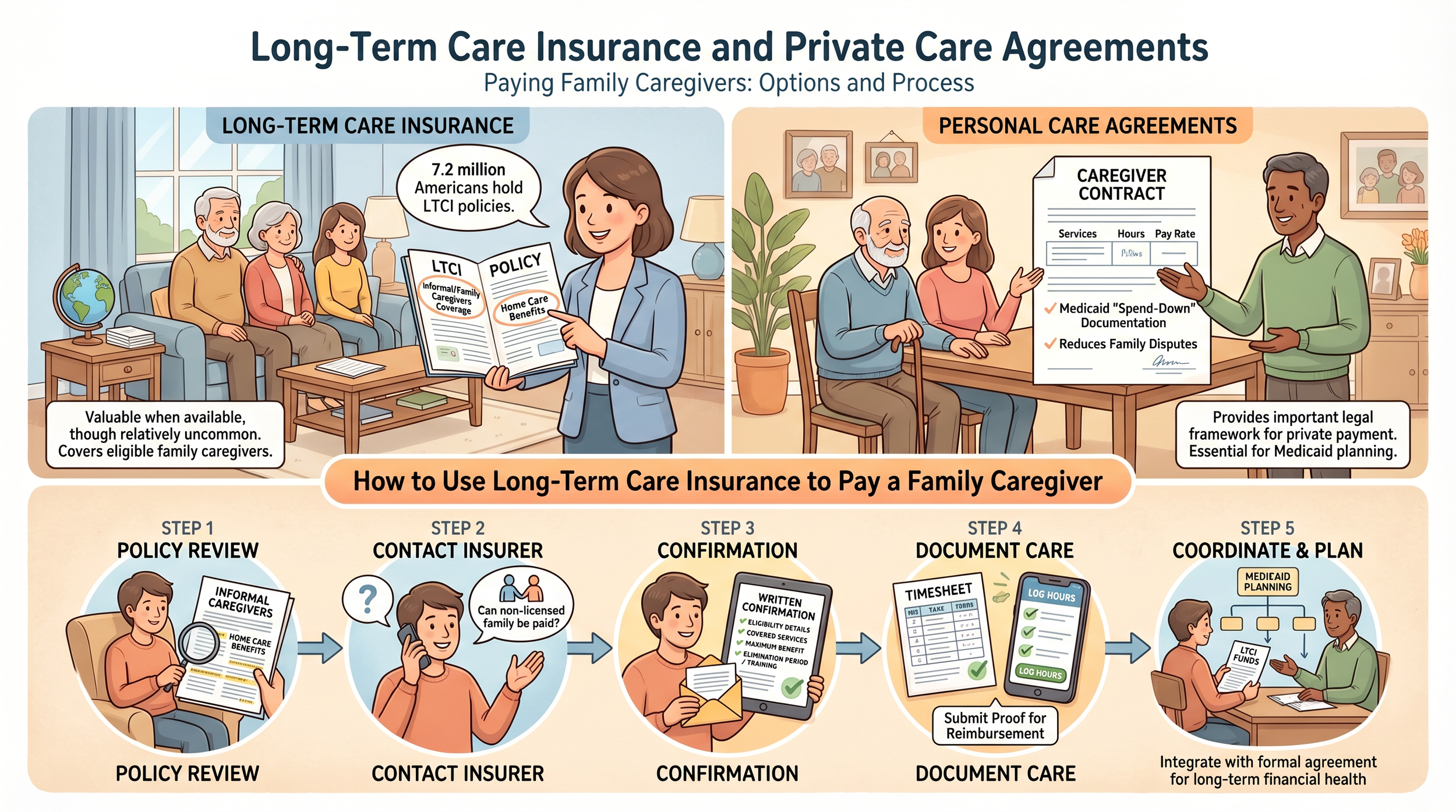 Some families pay family members privately using long-term care insurance benefits or out-of-pocket funds.