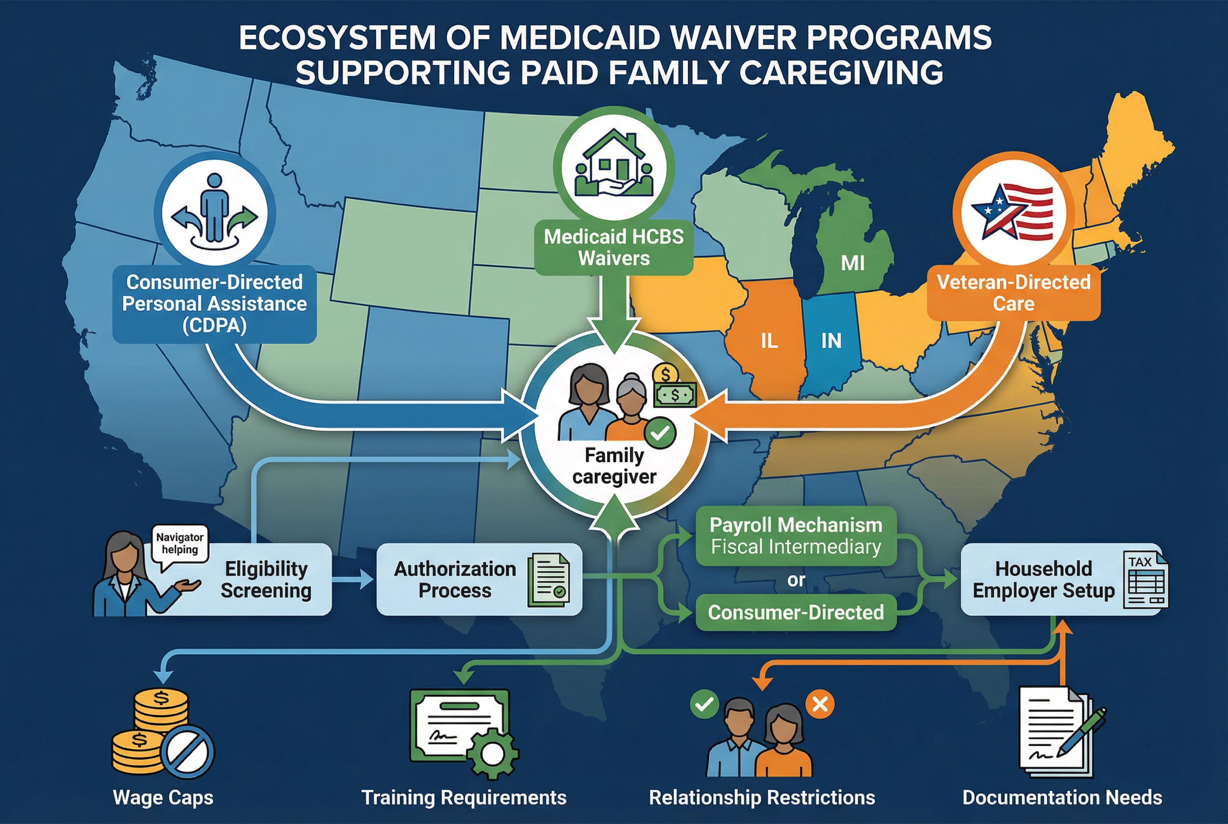 Common program types that permit family caregiver pay include consumer-directed personal assistance, certain Medicaid waivers for home and community-based services, and veteran-directed care programs, each with eligibility screens, authorization steps, and payroll flows. Eligibility often requires that the care recipient qualify for services under the stateβs waiver, designate a participant representative or employer, and complete required paperwork to authorize family member pay. Payments under these programs can be routed through state-authorized fiscal intermediaries or consumer-directed payroll mechanisms, which affect how you report wages and manage withholding. For families in Indiana, Michigan, and Illinois, program availability for paying family caregivers exists but practical enrollment and payroll procedures must be checked with the state or a program navigator.