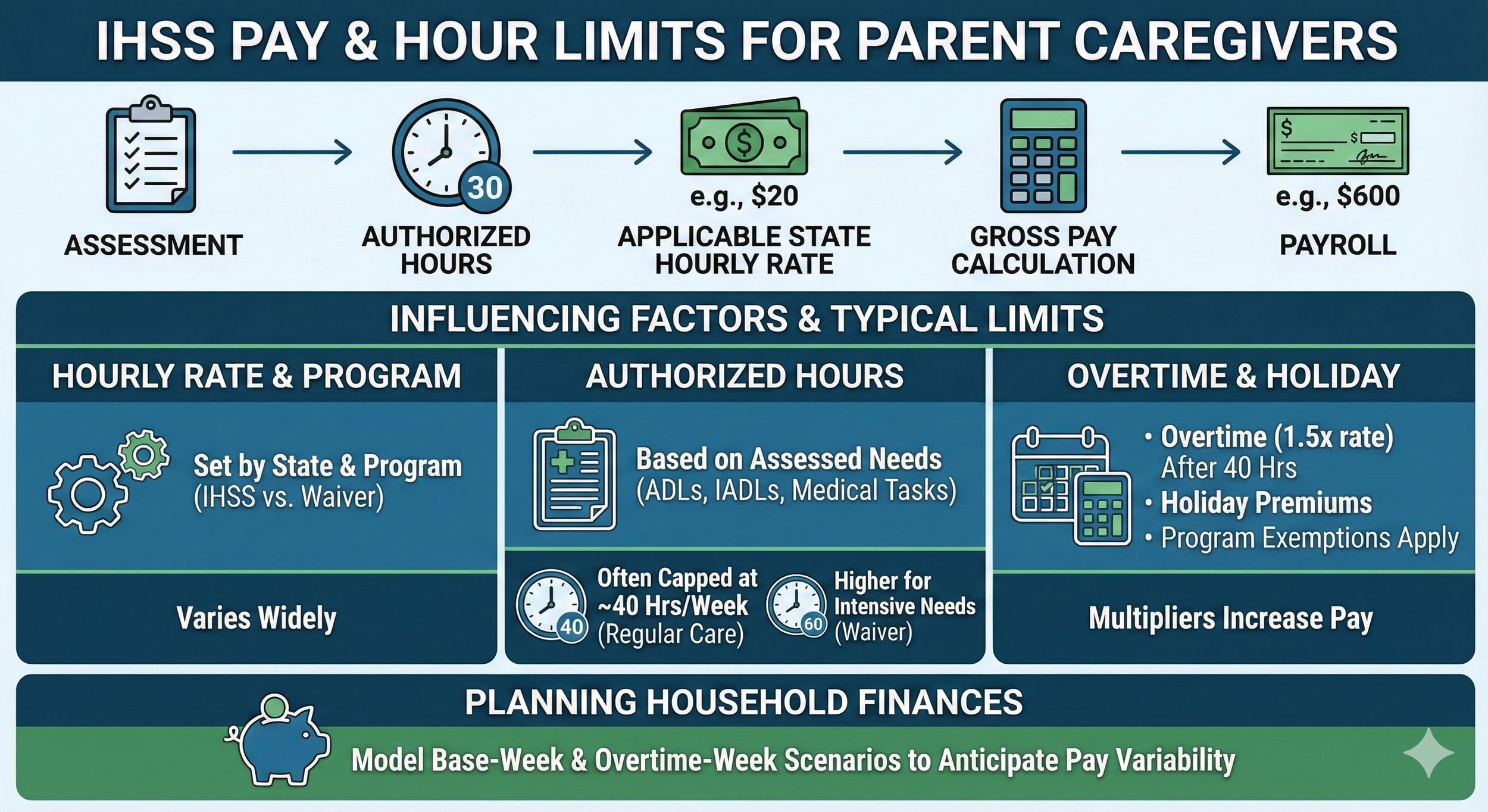 A basic example illustrates the calculation: if a state authorizes 30 hours per week at an hourly rate of $20, weekly gross pay is 30 × $20 = $600. Needs assessments influence that authorization by documenting how many hours are medically and functionally required for ADLs, IADLs, and medical tasks, and assessors often round to the nearest authorized hour block. Typical caps in many programs align around 40 hours per week for non-respite regular care, though higher hours can be authorized for intensive medical needs within certain waivers. Because holiday and overtime rules can change net pay, parents should model both base-week and overtime-week scenarios when planning household finances. The next subsection explains overtime and holiday rules in more detail to help parents anticipate pay variability.