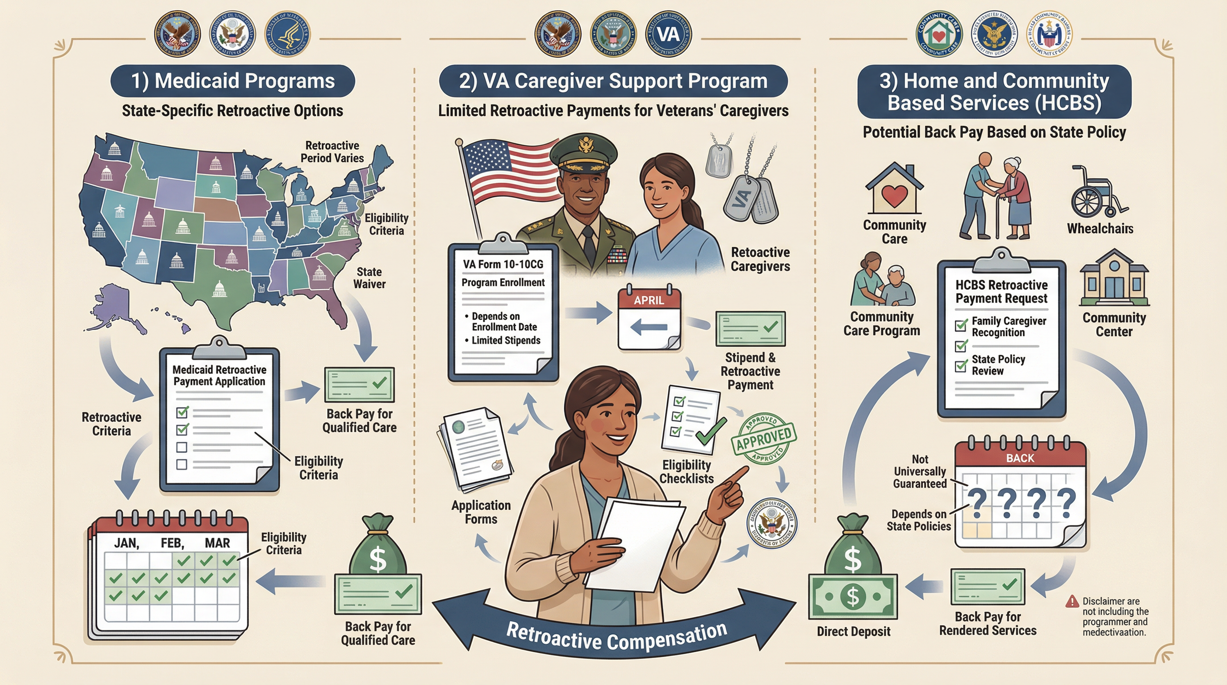 Home and Community Based Services (HCBS): Some states have HCBS programs that recognize family caregivers and may offer back pay for services rendered, but retroactive payments are not universally guaranteed and depend on state-specific policies.