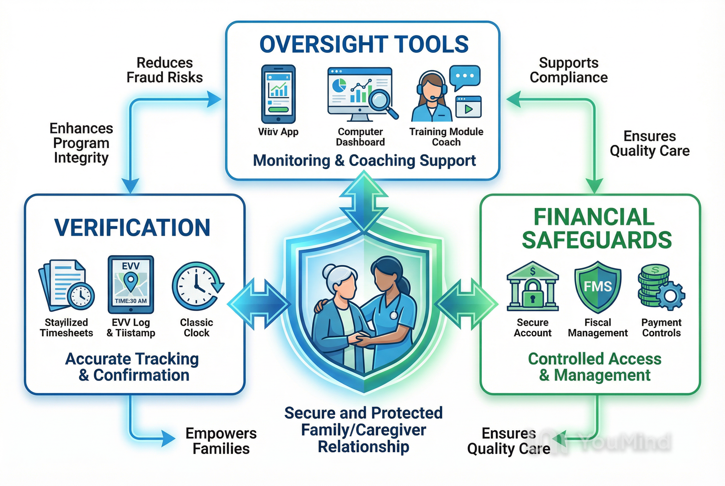 Fiscal Management Services (FMS) and Electronic Visit Verification (EVV) are complementary oversight tools designed to protect program integrity and simplify caregiver compliance. FMS acts as a fiscal intermediary, handling payments, payroll taxes, and budget reconciliation so caregivers receive approved wages while the program monitors spending against the authorized budget. EVV captures time and place for service delivery through methods like mobile apps, telephony, or GPS-enabled devices, ensuring billed hours match actual visits. Together, FMS and EVV create multiple verification layers: FMS reconciles payments and flags anomalies while EVV provides timestamped evidence that services occurred at specified times and locations. The following subsections examine each tool’s role and how families should interact with them.