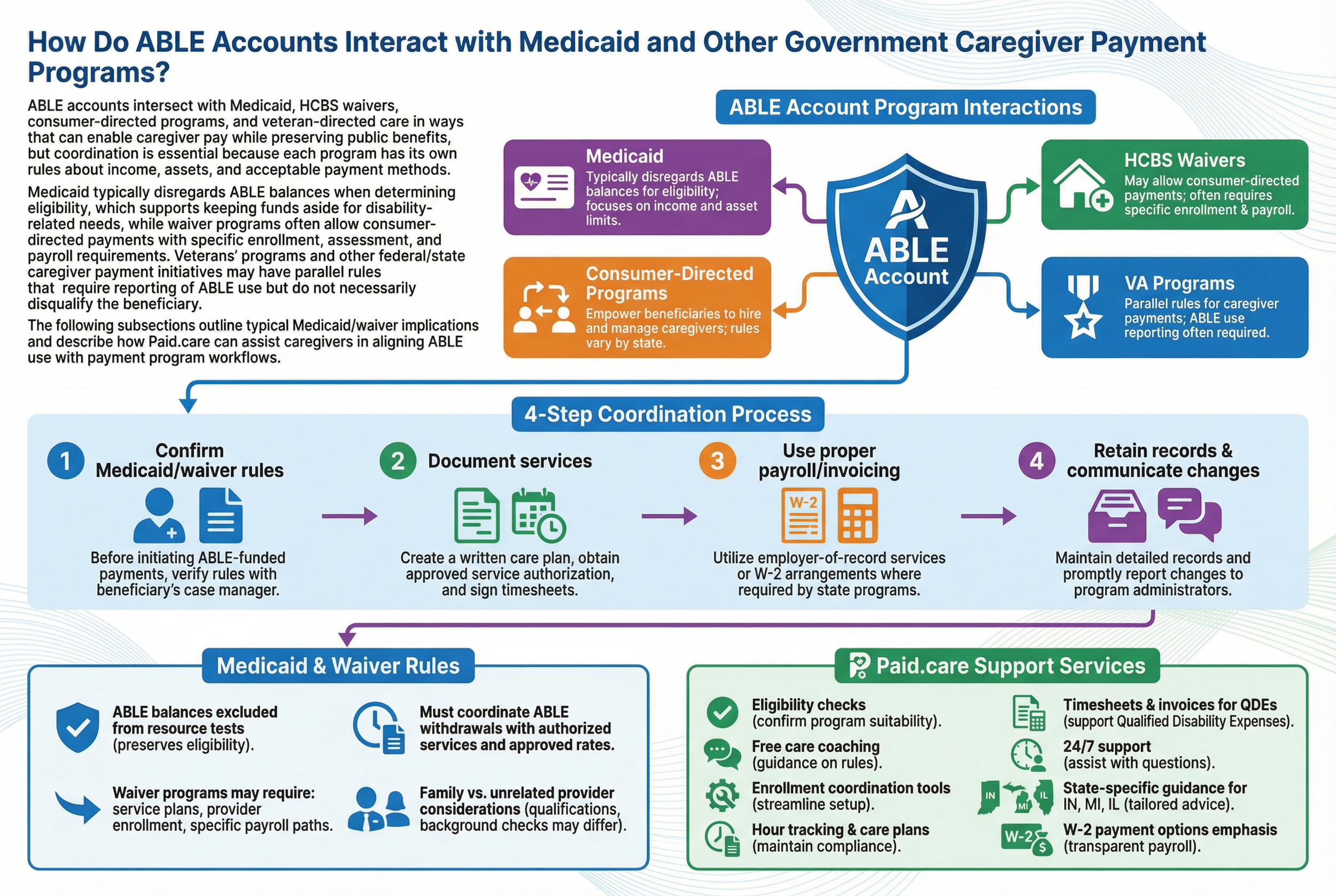 ABLE accounts intersect with Medicaid, HCBS waivers, consumer-directed programs, and veteran-directed care in ways that can enable caregiver pay while preserving public benefits, but coordination is essential because each program has its own rules about income, assets, and acceptable payment methods. Medicaid typically disregards ABLE balances when determining eligibility, which supports keeping funds aside for disability-related needs, while waiver programs often allow consumer-directed payments with specific enrollment, assessment, and payroll requirements. Veterans’ programs and other federal/state caregiver payment initiatives may have parallel rules that require reporting of ABLE use but do not necessarily disqualify the beneficiary. The following subsections outline typical Medicaid/waiver implications and describe how Paid.care can assist caregivers in aligning ABLE use with payment program workflows.